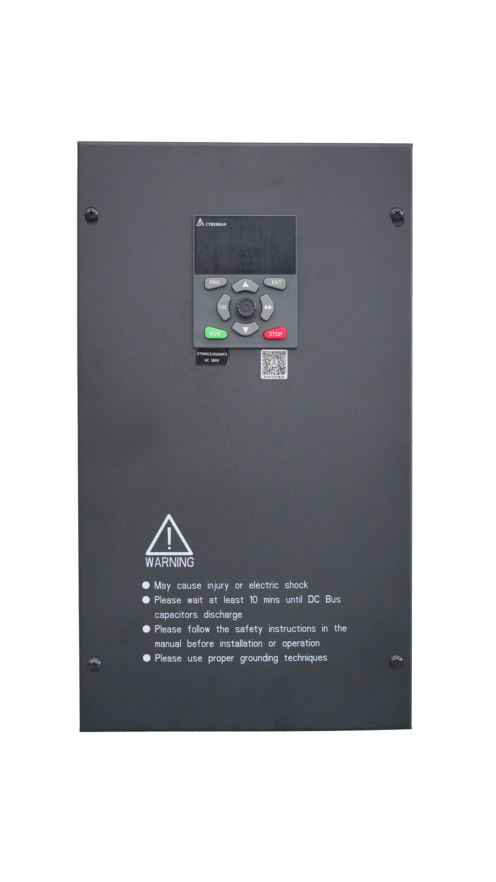 设备采用灰色金属外壳,坚固耐用;操作面板集成PRG编程、RUN启动、STOP急停等按键,搭配LED显示屏,参数设置与状态监控一键直达,新手也能快速上手。机身醒目的高压警示标识,时刻提醒安全操作,防护细节拉满。